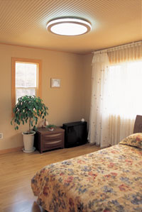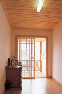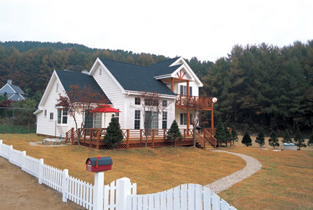 집은 연면적 40평(1층 32평, 2층 8평)평 복층 경량 목조주택으로, 외벽은 시멘트 사이딩과 이미지 스톤으로 마감하고, 물매 가파른 뾰족 지붕엔 이중 그림자 아스팔트 슁글을 얹었다. 나무로 만든 나지막한 흰색 펜스, 대문에서 현관까지 10여 미터 이르는 곡선 모양의 자갈길, 전면에서 우측면까지 덱을 널찍하게 내어 전원주택의 운치를 한껏 돋우었다. 여기에 잣나무 군락이 어우러져 꼭 동화 속의 집을 보는 듯하다.